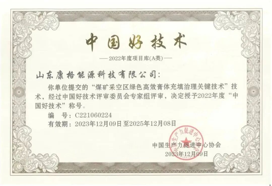 从充填开采技术获得山东省科学技术进步奖,到荣获“2022年度中国好技术”,再到作为主要起草单位参与多项能源行业标准的编制,康格科技已经稳稳地立足在充填开采领域。